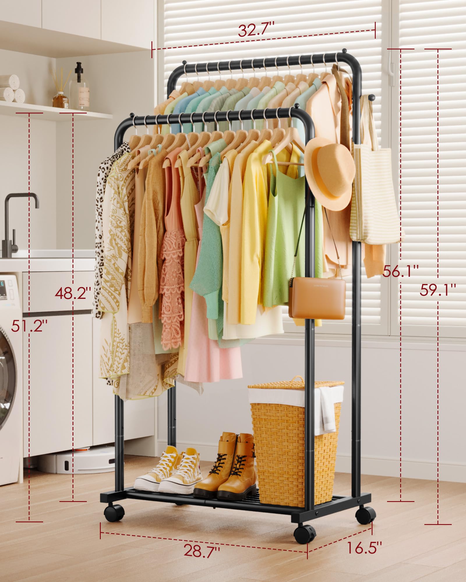 Sakugi Clothes Rack - Double Rods Clothing Rack with Mesh Shelf, Hooks & Wheels, Metal Clothing Racks for Hanging Clothes & Bags, Multifunctional Garment Rack for Laundry, Black, 28.7" x 16.5" x 59.1"
