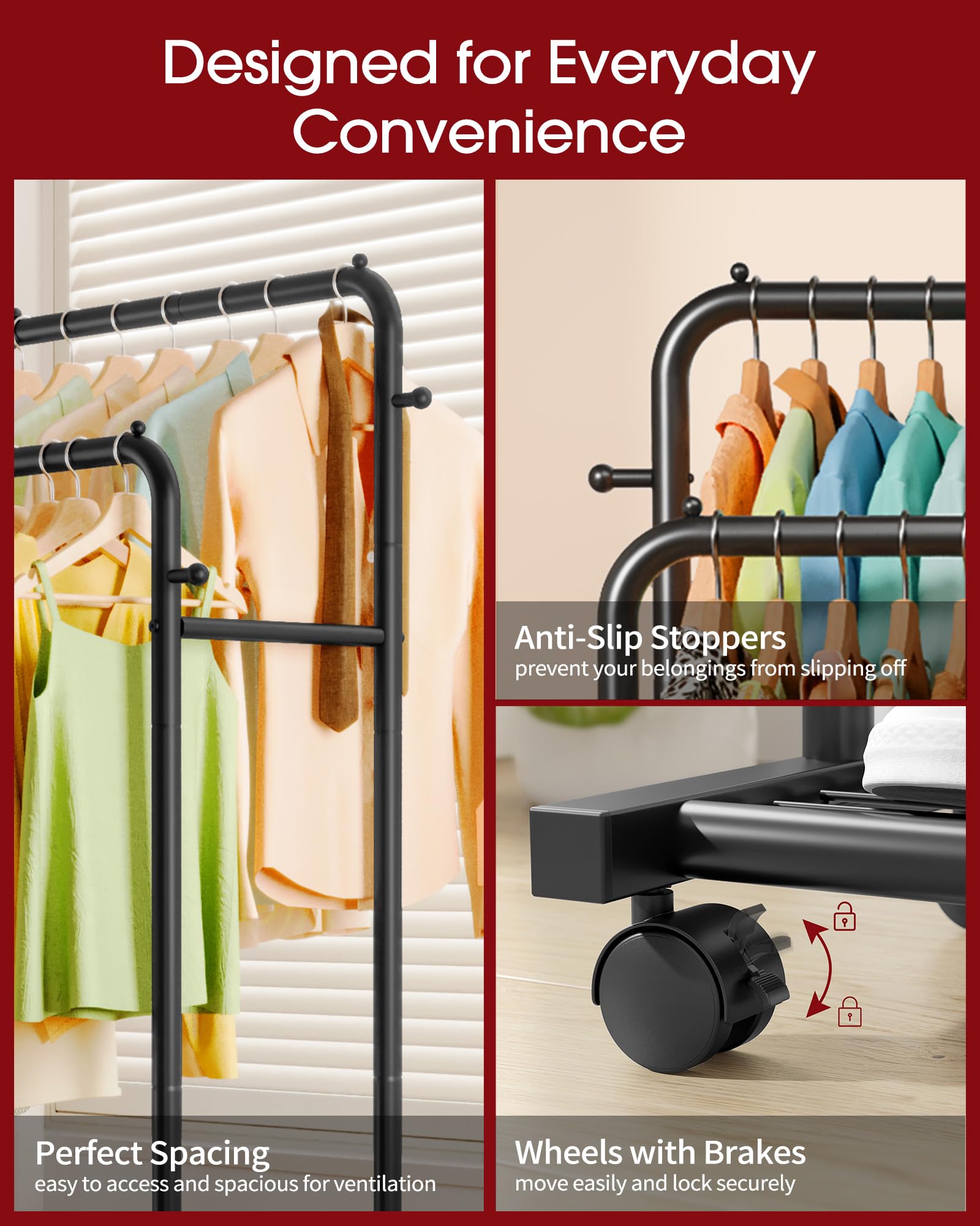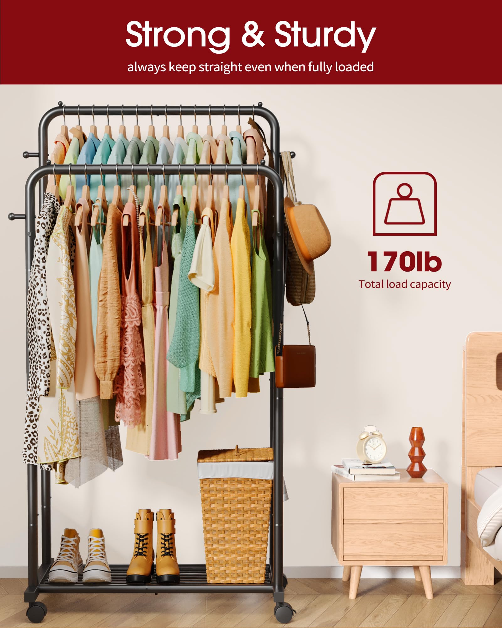 - ALL-IN-1 STORAGE SOLUTION: Featuring a double-rod structure, this heavy-duty clothes rack can hold up to 55 garments, offering ample space for various clothing types, from lightweight shirts to heavy outerwear. The 59.1-inch height is perfect for hanging longer items like dresses and pants without them dragging. Moreover, the additional 4 practical hooks and 2 side bars provide the perfect spots for accessories such as bags, hats, belts, and scarves.
