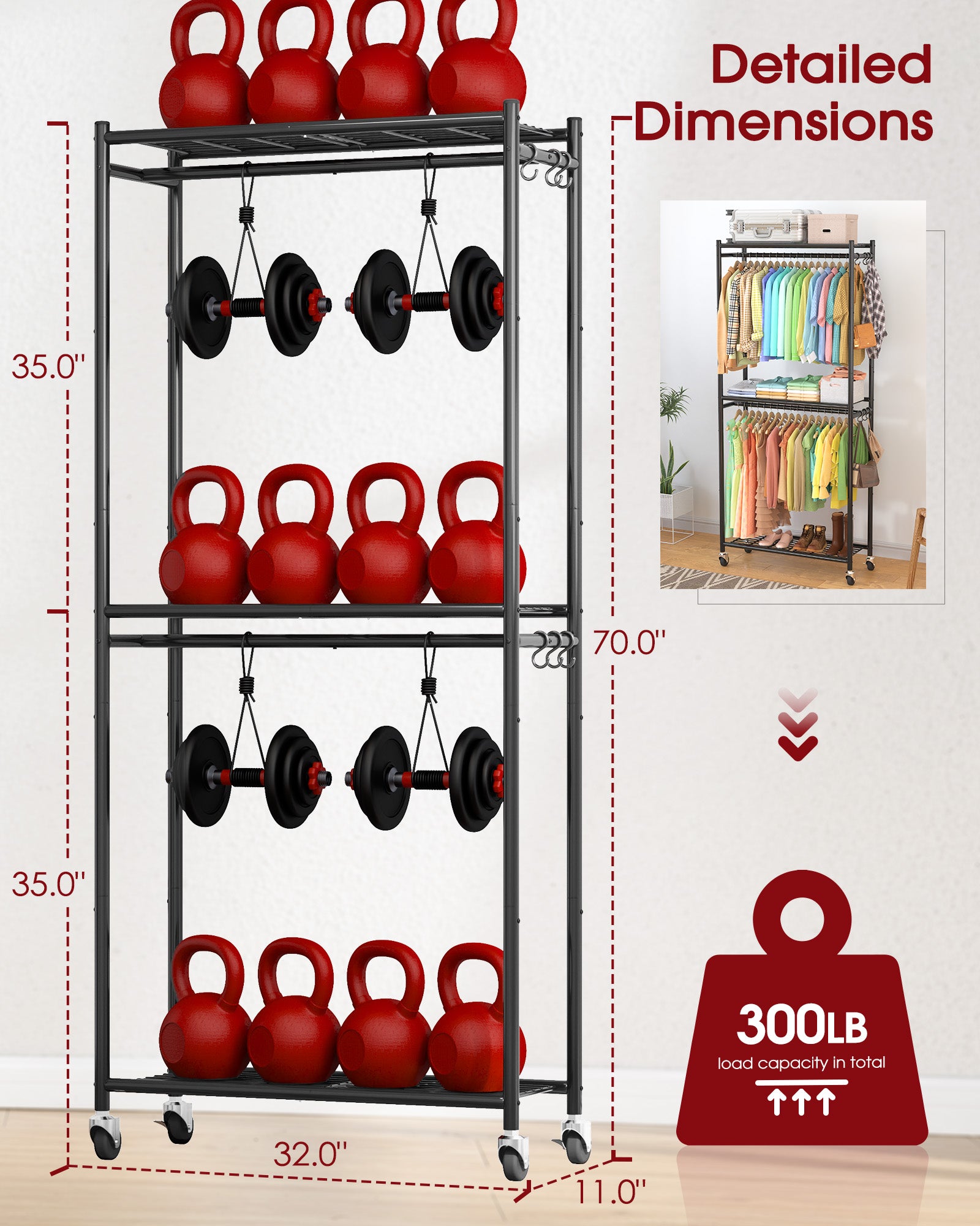 - Smooth Mobility: Four wheels make it easy to move; two are lockable to keep the rack steady when needed.