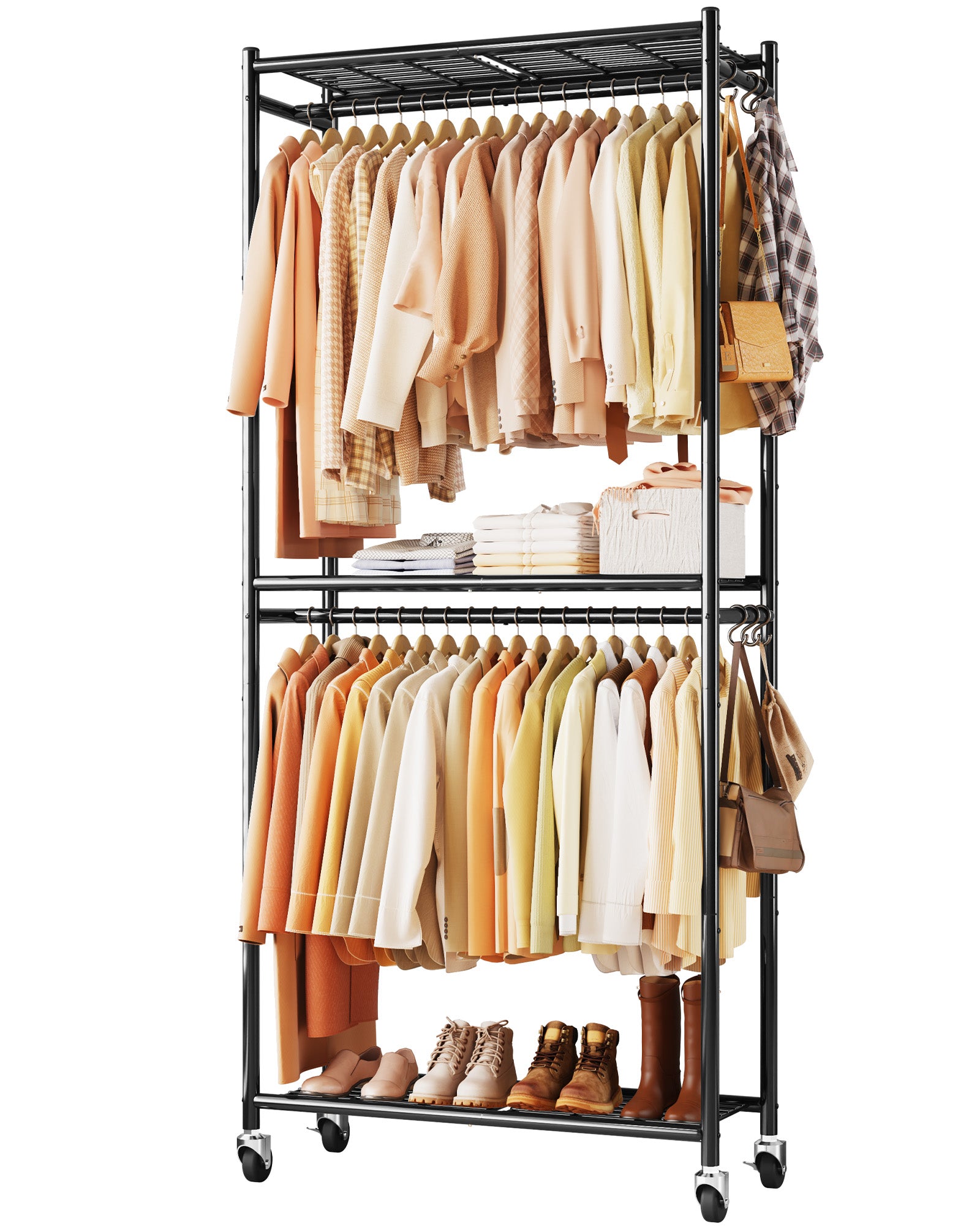 Sakugi Clothes Rack, Heavy-Duty Garment Rack with Shelves & Wheels, Freestanding Wardrobe Organizer with Hooks, Ideal for Bedroom, Laundry, or Balcony, 33.0" x 12.2" x 79.5", Black