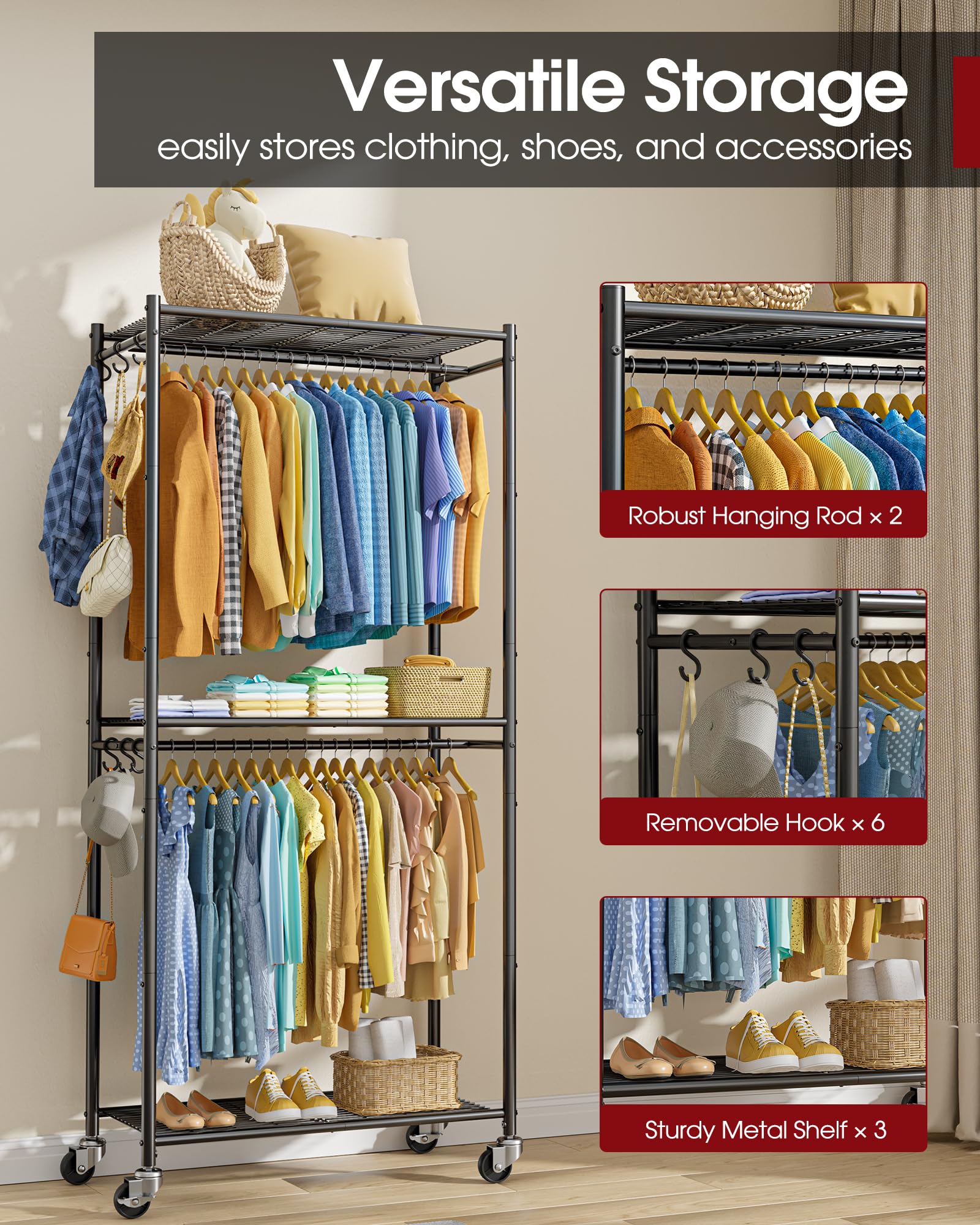 - ALL-IN-ONE GARMENT STORAGE: With dimensions of 33"×12.6"×79.5", this rolling clothes rack for hanging clothes features a full-length hanging rod, multiple shelves, and 6 detachable hooks. Its spacious layout accommodates seasonal clothing, shoes, and accessories, keeping garment storage organized and your living space clutter-free.