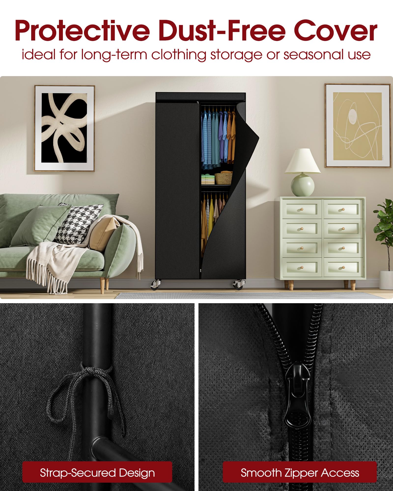 - DUST-RESISTANT COVER: This garment rack includes a removable dust cover that protects garments from dust, dirt, and moisture. Its three-way zippers offer easy access from any side, while pre-cut openings allow wall anchor straps to pass through. Keep clothes protected and make long-term storage simple with Sakugi clothing rack with cover!