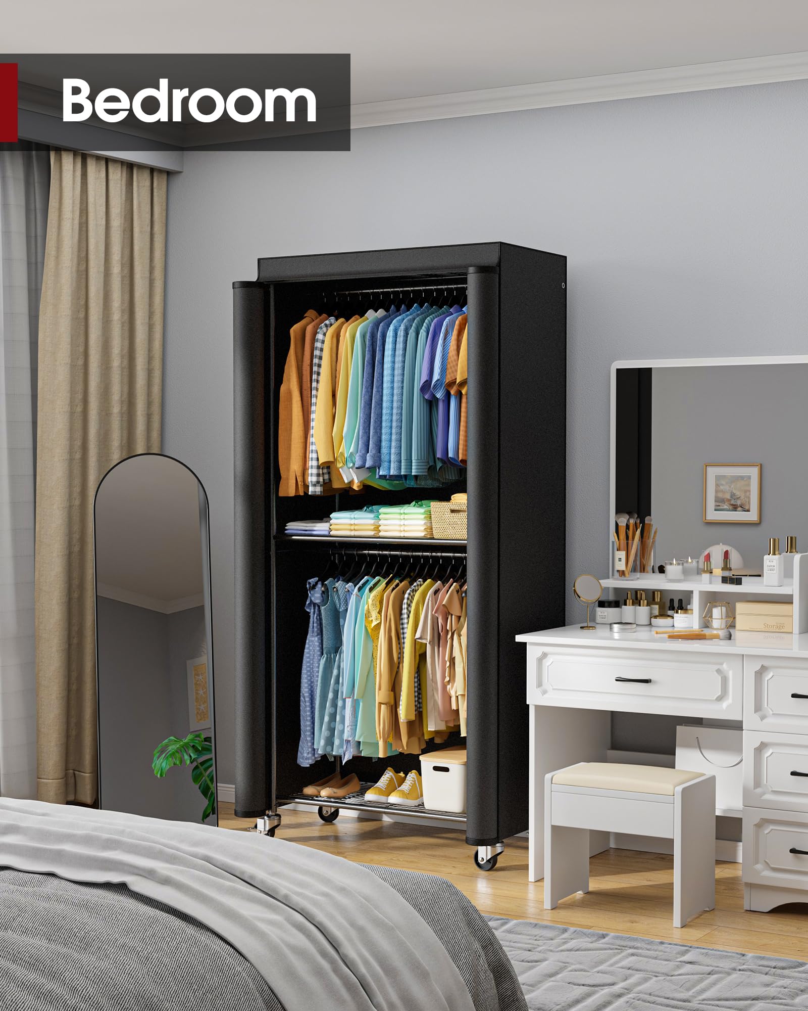 Sakugi Clothes Rack with Cover - Spacious Wardrobe Closet with Lockable Wheels, Rust-Proof Clothing Racks for Hanging Clothes, Accessories in Bedroom, Living Room, Doorway, 33"×12.6"×79.5", Black