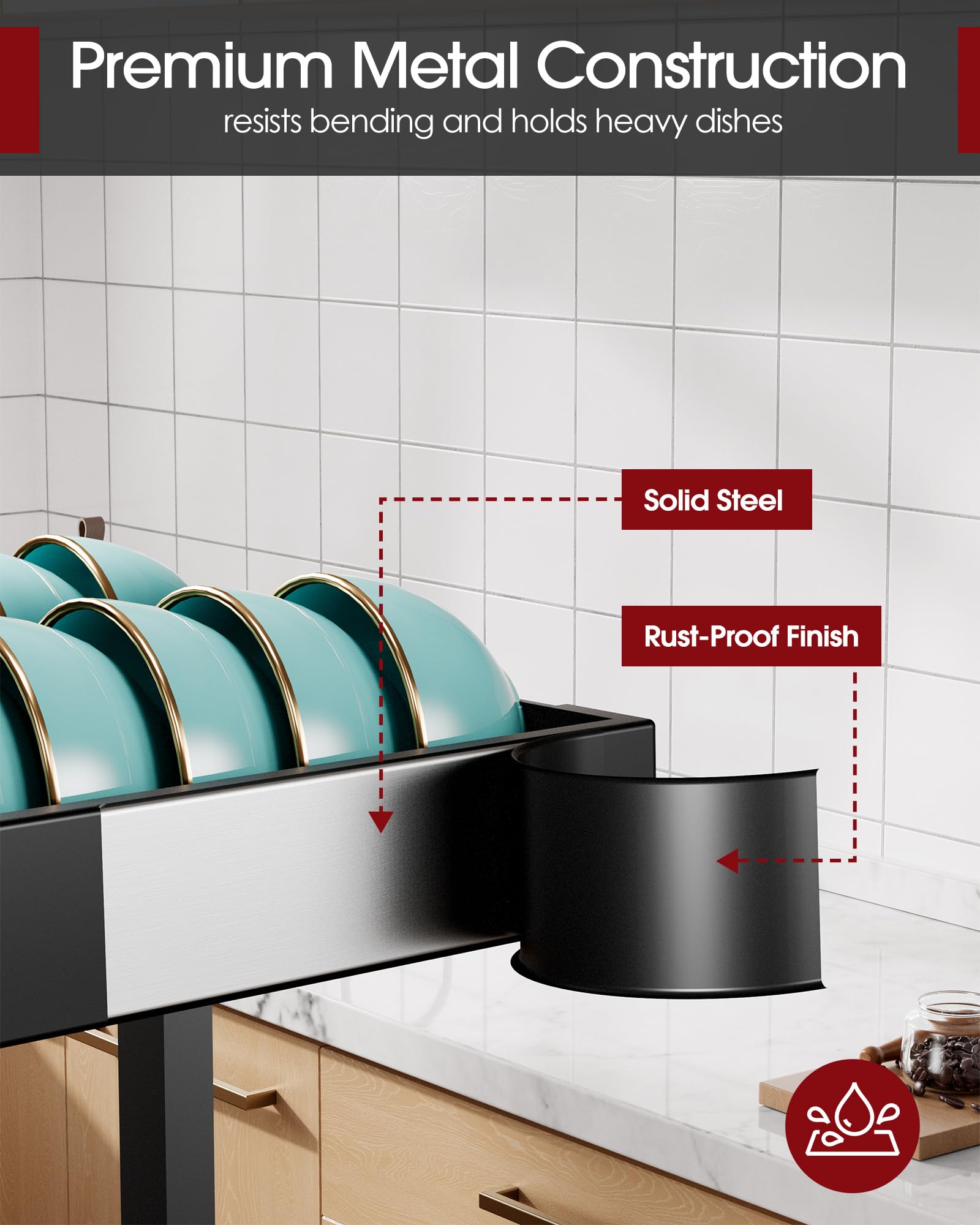 - STAINLESS STEEL CONSTRUCTION: Made from premium stainless steel with a rust-resistant coating, this dish rack for kitchen counter maintains a polished, modern look even with daily use. The solid metal frame resists bending or warping, ensuring long-term reliability. Its smooth surface is easy to wipe clean and hygienic, keeping your kitchen safe and fresh for everyday cooking and dishwashing tasks.