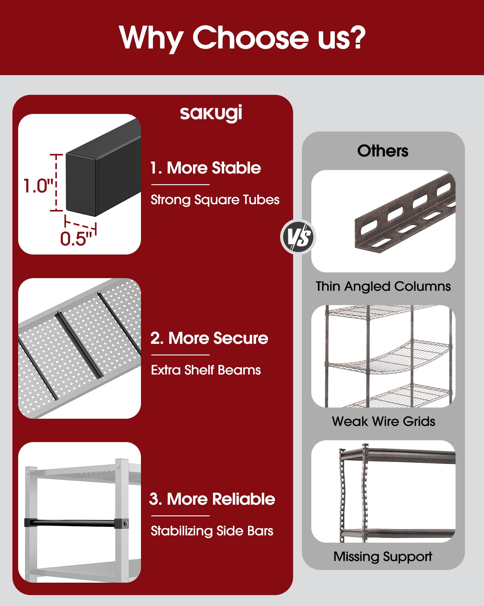 - REINFORCED FOR HEAVY LOADS:Constructed with high-strength metal framing and reinforced base beams on every tier, this wire shelving is built for long-term durability and dependable performance. The square-profile vertical posts and reinforced design enhance structural integrity, providing reliable support for tools, bins, and bulky items in your garage, basement, or workshop.