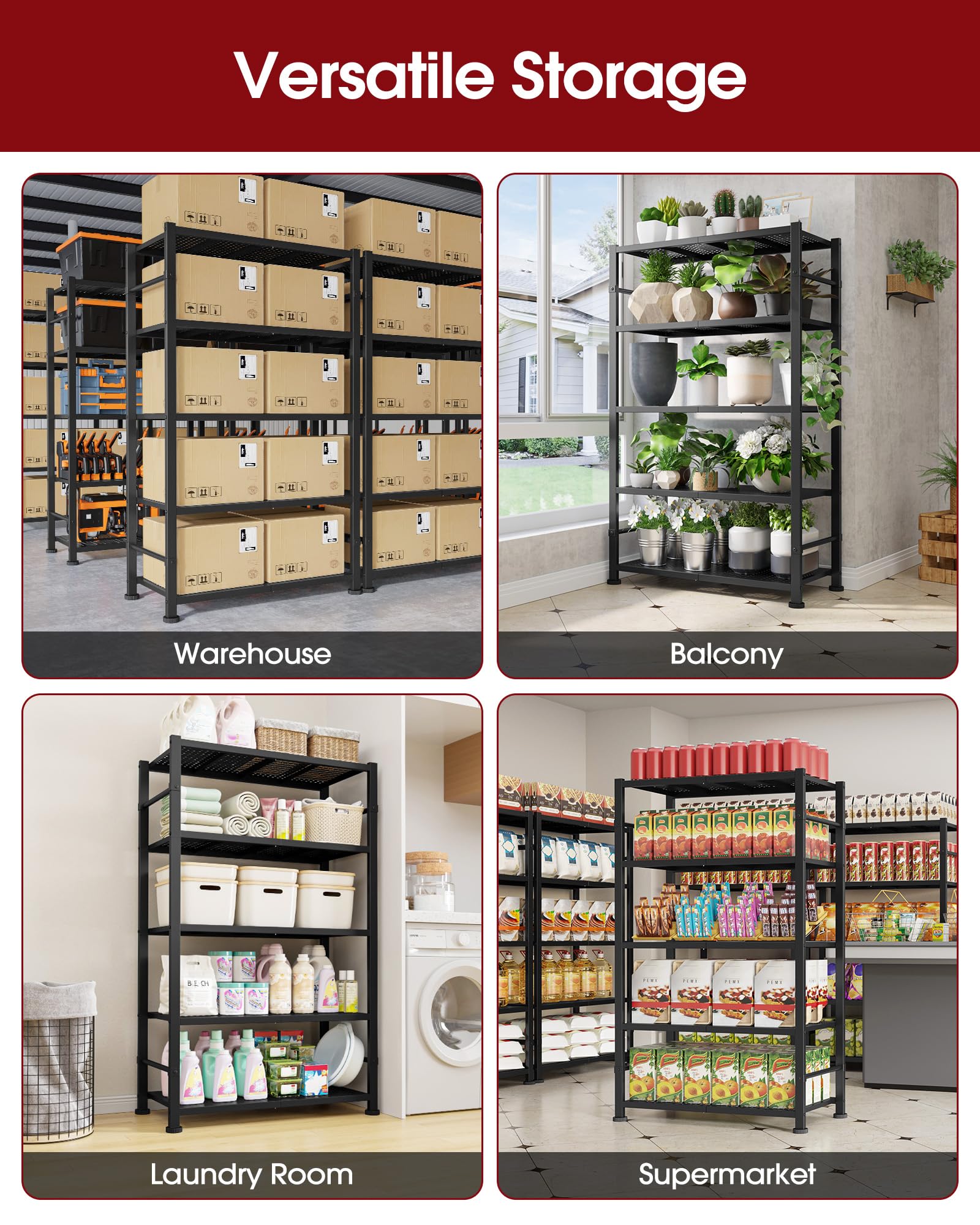 - VERSATILE STORAGE FOR ANY SPACE: Featuring adjustable leveling feet for enhanced stability on uneven floors, this metal shelf with reinforced frame provides dependable support in garages, basements, warehouses, or commercial spaces. Whether for daily use or heavy-duty storage, it delivers reliable, robust, and long-lasting performance.