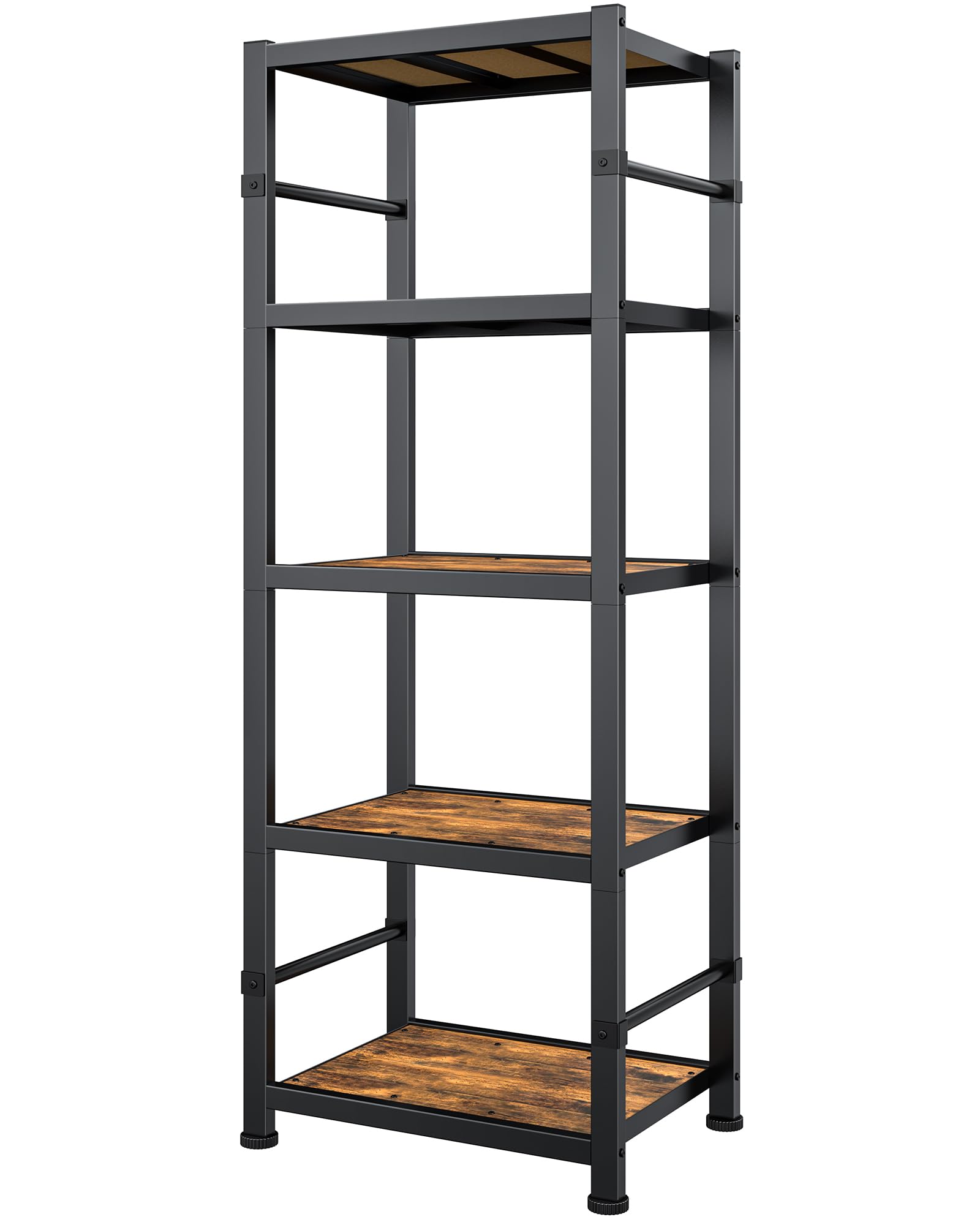 - RELIABLE STABILITY FOR EVERYDAY USE:Built to hold up under daily use, this 5-tier wire shelving unit with shelf boards features reinforced side bars, support shelf bars, and 4 adjustable leveling feet for enhanced stability. Whether in the kitchen, pantry, or laundry room, it stays firmly in place to support your storage needs with confidence.